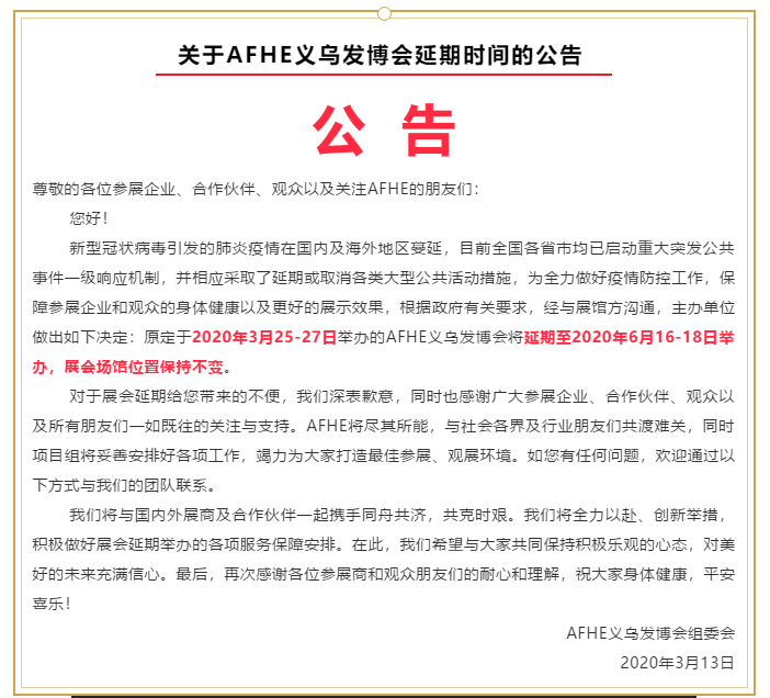 根據(jù)發(fā)博會(huì)設(shè)計(jì)搭建公司領(lǐng)藝展覽了解到,受疫情影響原定于2020年3月25-27日舉辦的AFHE義烏發(fā)博會(huì)將延期至2020年6月16-18日舉辦,展會(huì)場(chǎng)館位置保持不變。如需發(fā)博會(huì)設(shè)計(jì)請(qǐng)聯(lián)系領(lǐng)藝展覽,希望我們能在發(fā)博會(huì)搭建上為您添磚加瓦,祝各位朋友收獲多多,滿載而歸!