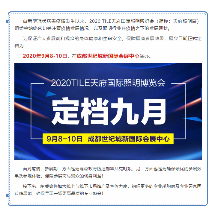 根據(jù)成都照明展設(shè)計搭建公司領(lǐng)藝展覽了解到,為保證廣大參展商和觀眾的身體健康和生命安全,保障展商參展效果,展會日期正式定檔為:2020年9月8-10日,在成都世紀(jì)城新國際會展中心舉辦。如需照明展設(shè)計請聯(lián)系領(lǐng)藝展覽,希望我們能在照明展搭建上為您添磚加瓦,祝各位朋友收獲多多,滿載而歸!