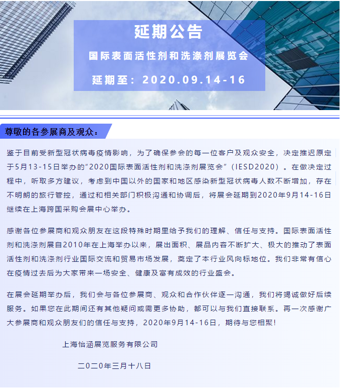 根據(jù)上海展臺設(shè)計(jì)搭建公司領(lǐng)藝展覽了解到,鑒于目前受新型冠狀病毒疫情影響,為了確保參會的每一位客戶及觀眾安全,決定推遲原定于5月13-15日舉辦的“2020國際表面活性劑和洗滌劑展覽會”(IESD2020)。將展會延期到2020年9月14-16日繼續(xù)在上??鐕少彆怪行呐e辦。如需上海展會設(shè)計(jì)請聯(lián)系領(lǐng)藝展覽,希望我們能在上海展臺搭建上為您添磚加瓦,祝各位朋友收獲多多,滿載而歸!