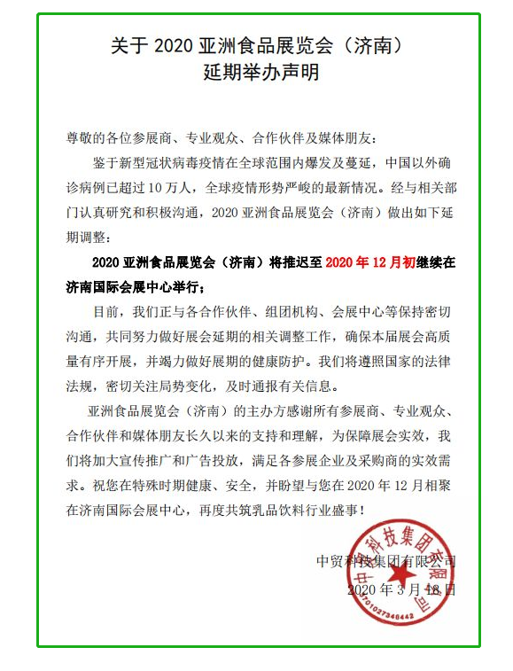 2020第14屆中國(guó)(山東)國(guó)際乳品飲料展覽會(huì)延期舉辦