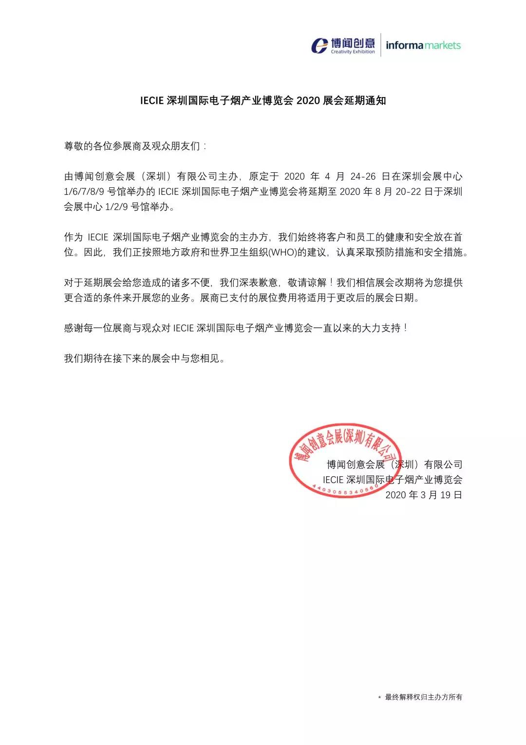 根據(jù)電子煙展設(shè)計(jì)搭建公司領(lǐng)藝展覽了解到,原定于2020年4月24日—26日的2020深圳國(guó)際電子煙產(chǎn)業(yè)博覽會(huì)將延期至2020年8月20日—22日舉辦, 展會(huì)地點(diǎn)為深圳會(huì)展中心(福田區(qū))1/2/9號(hào)館。如需電子煙展設(shè)計(jì)請(qǐng)聯(lián)系領(lǐng)藝展覽,希望我們能在電子煙展搭建上為您添磚加瓦,祝各位朋友收獲多多,滿載而歸!