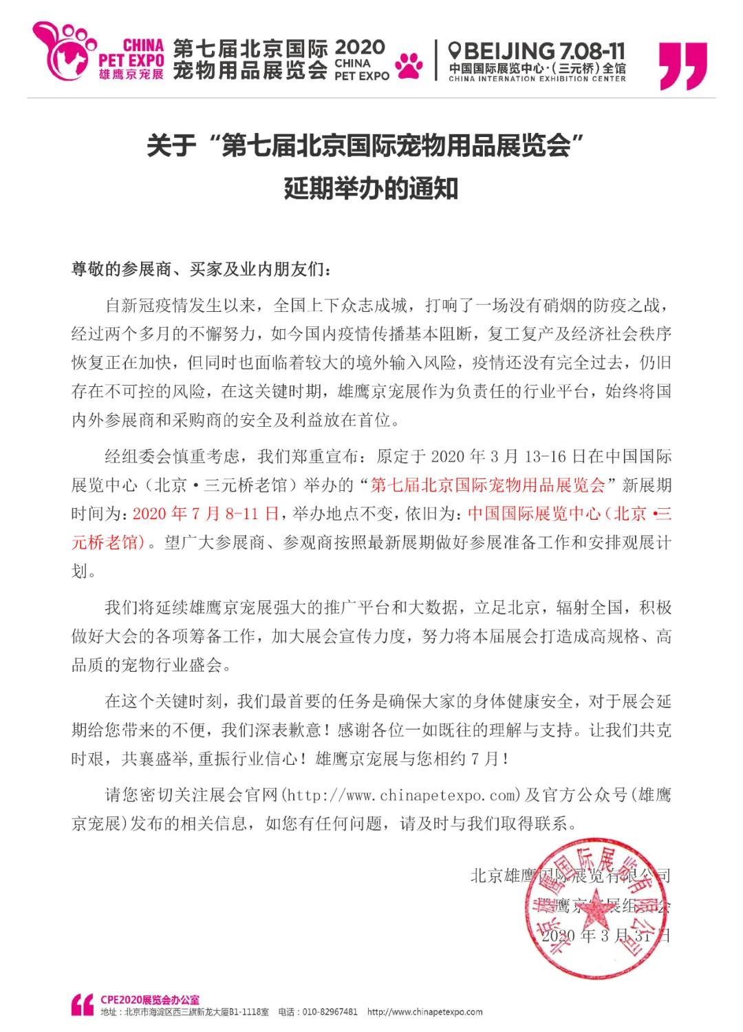 根據(jù)寵物展設(shè)計(jì)搭建公司領(lǐng)藝展覽了解到,原定于2020年3月13-16日在中國(guó)國(guó)際展覽中心(北京·三元橋老館)舉辦的“第七屆北京國(guó)際寵物用品展覽會(huì)”新展期時(shí)間為:2020年7月8-11日,舉辦地點(diǎn)不變,依舊為:中國(guó)國(guó)際展覽中心(北京·三元橋老館)。如需寵物展設(shè)計(jì)請(qǐng)聯(lián)系領(lǐng)藝展覽,希望我們能在寵物展搭建上為您添磚加瓦,祝各位朋友收獲多多,滿載而歸!