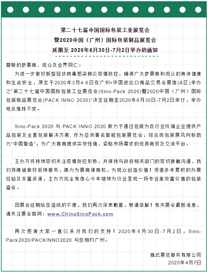 根據(jù)包裝展設計搭建公司領藝展覽了解到,原定于2020年3月4-6日在廣州?中國進出口商品交易會展館(A區(qū))舉辦之“第二十七屆中國國際包裝工業(yè)展覽會(Sino-Pack 2020)暨2020中國(廣州)國際包裝制品展覽會(PACK INNO 2020)”決定延期至2020年6月30日-7月2日舉行,舉辦地點維持不變。如需包裝展設計請聯(lián)系領藝展覽,希望我們能在包裝展搭建上為您添磚加瓦,祝各位朋友收獲多多,滿載而歸!