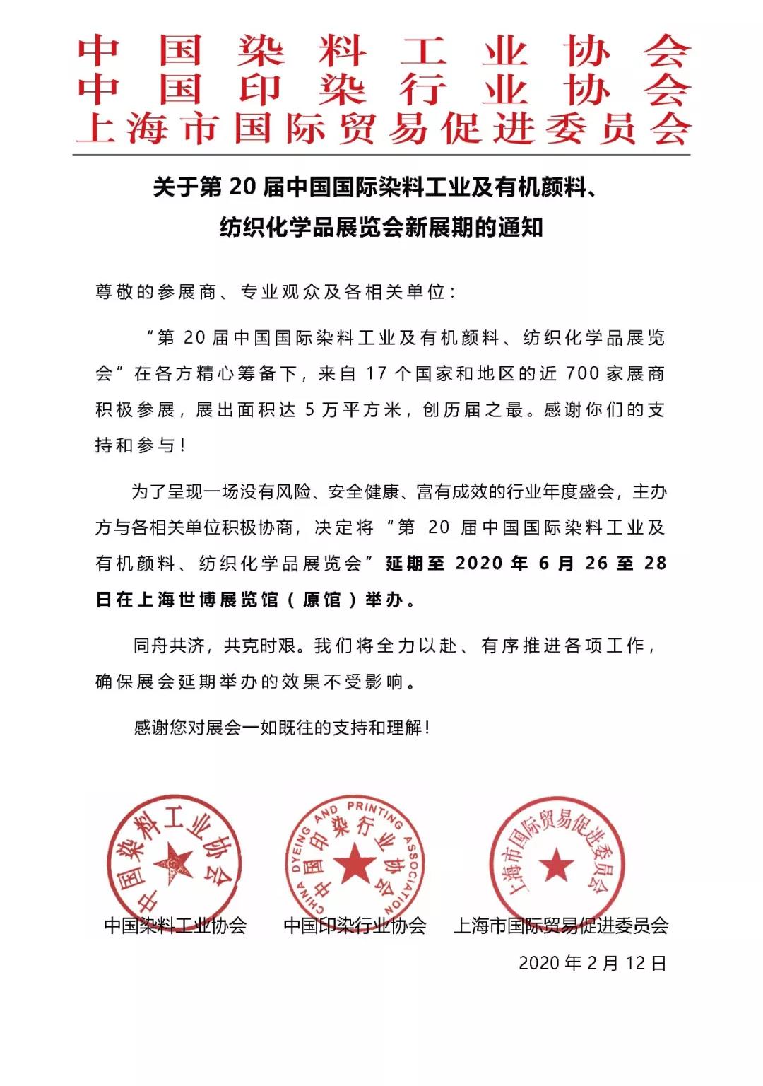 根據(jù)上海染料展設(shè)計(jì)搭建公司領(lǐng)藝展覽解到,為進(jìn)一步做好疫情防控工作,切實(shí)保障廣大展商、觀眾及相關(guān)工作人員的健康與安全、確保參展效果,原定于2020年4月8至10日在上海世博展覽館舉辦的“2020中國國際染料工業(yè)及有機(jī)顏料、紡織化學(xué)品展覽會”將延期舉辦。如需上海染料展設(shè)計(jì)請聯(lián)系領(lǐng)藝展覽,希望我們能在上海染料展搭建上為您添磚加瓦,祝各位朋友收獲多多,滿載而歸!