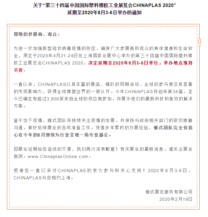 根據(jù)橡塑展設計搭建公司領藝展覽解到,為進一步加強新型冠狀病毒疫情的防控,確保廣大參展商和觀眾的身體健康和生命安全,原定于2020年4月21-24日在上海國家會展中心舉辦的第三十四屆中國國際塑料橡膠工業(yè)展覽會CHINAPLAS 2020,決定延期至2020年8月3-6日舉行,舉辦地點維持不變。