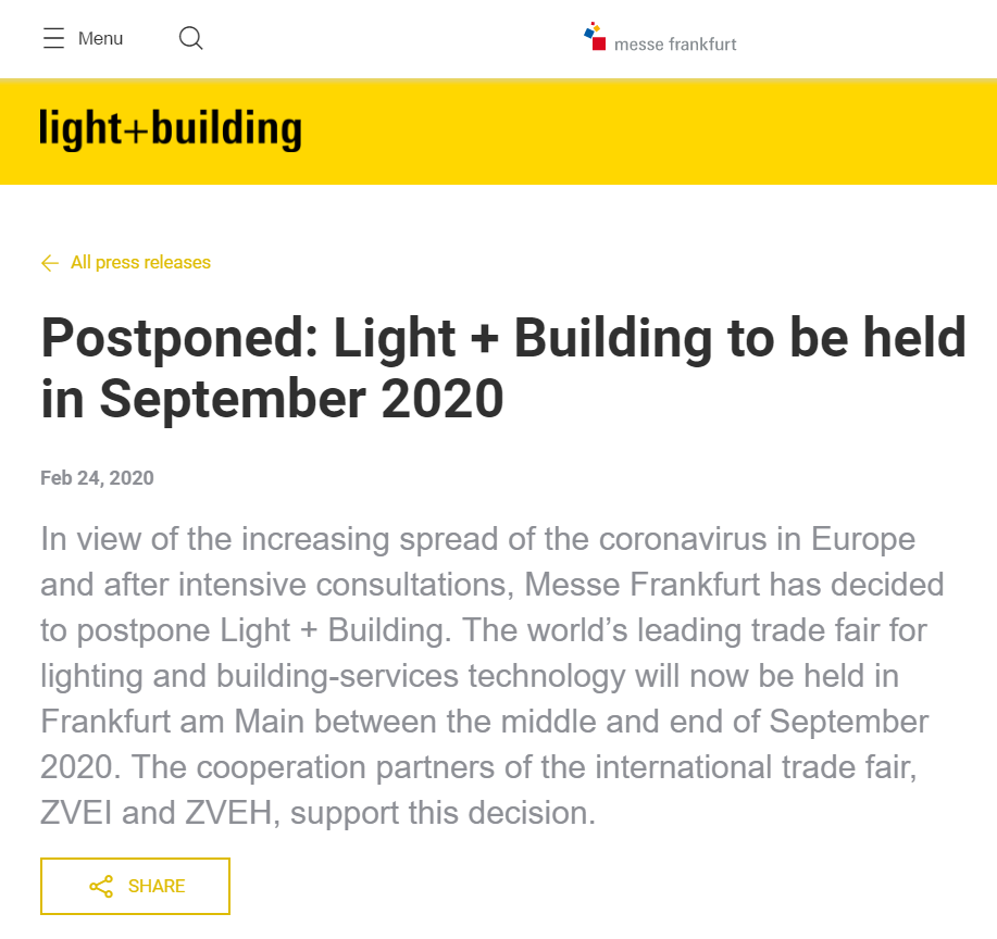 根據(jù)照明展設(shè)計搭建公司領(lǐng)藝展覽了解到,鑒于冠狀病毒在歐洲的蔓延以及經(jīng)過深入的磋商,法蘭克福展覽有限公司已決定推遲Light + Building?,F(xiàn)世界領(lǐng)先的照明和建筑服務(wù)技術(shù)貿(mào)易展覽會將延期至2020年9月中旬至美因河畔法蘭克福舉行。如需照明展設(shè)計請聯(lián)系領(lǐng)藝展覽,希望我們能在照明展搭建上為您添磚加瓦,祝各位朋友收獲多多,滿載而歸!