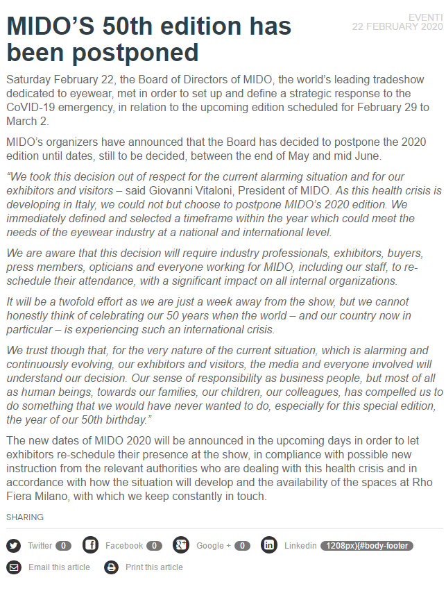 根據(jù)光學(xué)眼鏡展設(shè)計(jì)搭建公司領(lǐng)藝展覽了解到,全球規(guī)模最大的眼鏡專業(yè)展——米蘭國際光學(xué)眼鏡展主辦方宣布,鑒于疫情把每年一度的展會推遲到5月底至6月中旬,具體日期仍有待決定。如需光學(xué)展設(shè)計(jì)請聯(lián)系領(lǐng)藝展覽,希望我們能在眼鏡展搭建上為您添磚加瓦,祝各位朋友收獲多多,滿載而歸!