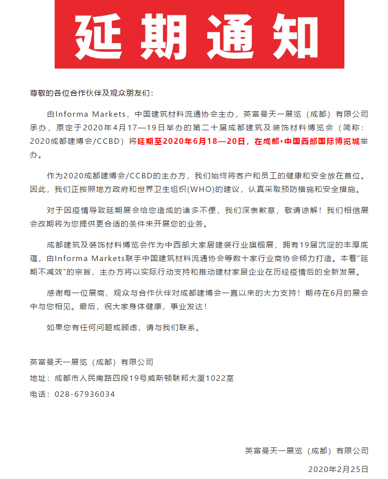 根據(jù)成都建博會(huì)設(shè)計(jì)搭建公司領(lǐng)藝展覽了解到,由Informa Markets,中國建筑材料流通協(xié)會(huì)主辦,英富曼天一展覽(成都)有限公司承辦,原定于2020年4月17—19日舉辦的第二十屆成都建筑及裝飾材料博覽會(huì)(簡稱:2020成都建博會(huì)/CCBD)將延期至2020年6月18—20日,在成都·中國西部國際博覽城舉辦。