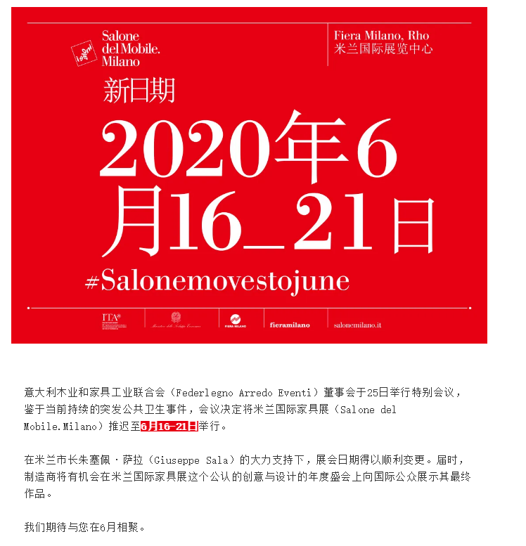 根據(jù)家具展展臺(tái)設(shè)計(jì)公司領(lǐng)藝展覽了解到,意大利木業(yè)和家具工業(yè)聯(lián)合會(huì)(Federlegno Arredo Eventi)董事會(huì)于25日舉行特別會(huì)議,鑒于當(dāng)前持續(xù)的突發(fā)公共衛(wèi)生事件,會(huì)議決定將米蘭國際家具展(Salone del Mobile.Milano)推遲至6月16-21日舉行。在米蘭市長(zhǎng)朱塞佩·薩拉(Giuseppe Sala)的大力支持下,展會(huì)日期得以順利變更。屆時(shí),制造商將有機(jī)會(huì)在米蘭國際家具展這個(gè)公認(rèn)的創(chuàng)意與設(shè)計(jì)的年度盛會(huì)上向國際公眾展示其最終作品。如需家具展展位設(shè)計(jì)裝修請(qǐng)聯(lián)系領(lǐng)藝展覽,希望我們能在家具展布展搭建上為您添磚加瓦,祝各位朋友收獲多多,滿載而歸!