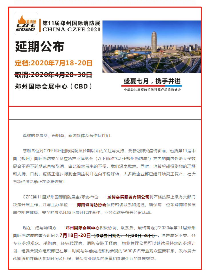 根據(jù)消防展設(shè)計搭建公司領(lǐng)藝展覽了解到,經(jīng)與場館方——鄭州國際會展中心積極協(xié)調(diào)、聯(lián)系后,主辦最終確定了2020年第11屆鄭州國際消防展的舉辦時間為7月18日-20日(原舉辦日期為:4月28日-30日),原定展館不變。如需消防展設(shè)計請聯(lián)系領(lǐng)藝展覽,希望我們能在消防展搭建上為您添磚加瓦,祝各位朋友收獲多多,滿載而歸!